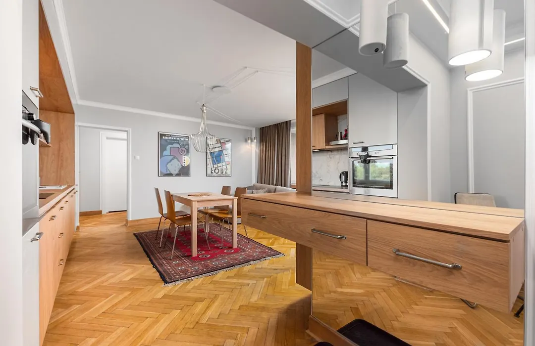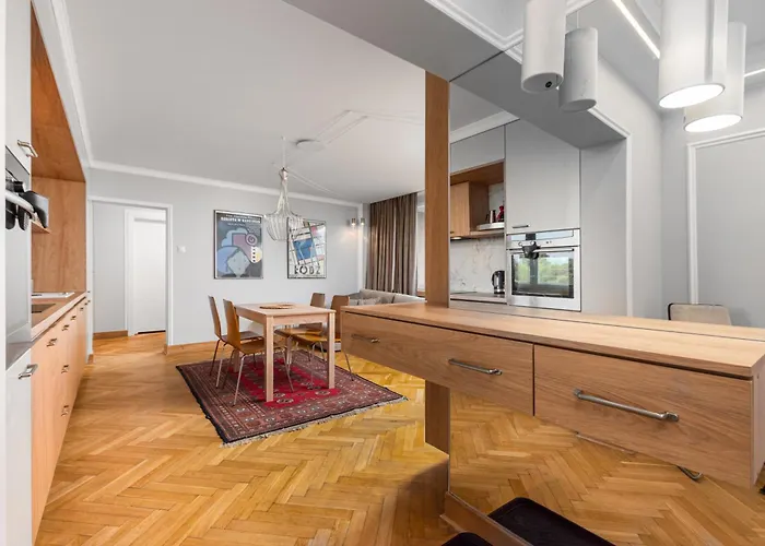 Do użytku gości wyposażony aneks kuchenny z piekarnikiem i zmywarką do naczyń. Najbliższa stacja metra to Ratusz Arsenał znajdująca się 600 m od tego apartamentu.